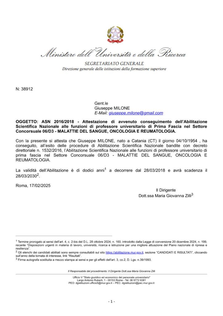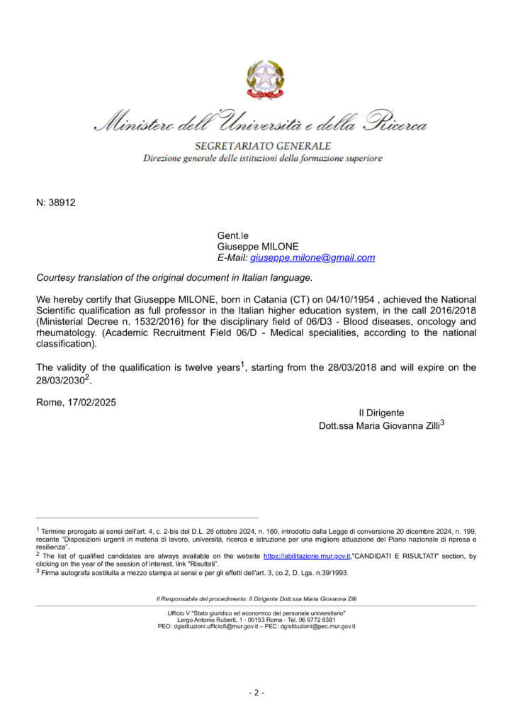 - Idoneità nazionale a Professore Ordinario di Ematologia (2018)